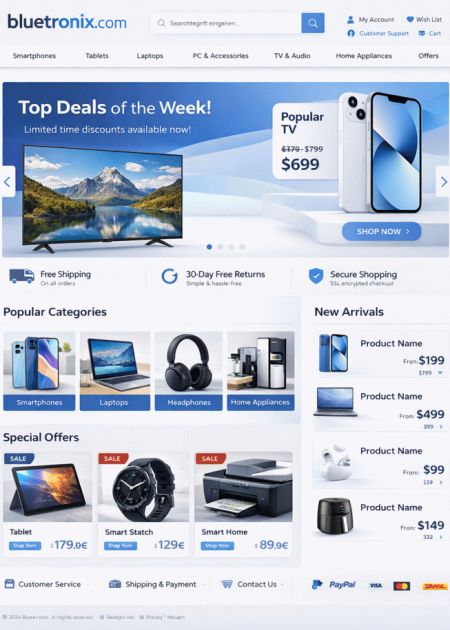 Na bluetronix máš v zásade tri možnosti. Po prvé, môžeš si svoj online obchod úplne vytvoriť sám v Website-Builde. Po druhé, môžeš si dať vytvoriť online obchod od bluetronix. Všetko bude pre teba predkonfigurované, vrátane rozloženia a základnej štruktúry. Potom môžeš obchod sám spravovať a pridávať obsahy, články a nastavenia. Po tretie, môžeš si dať svoj online obchod realizovať v rámci projektu Enterprise od bluetronix. To je obzvlášť vhodné pre rozsiahle a individuálne e-commerce projekty.