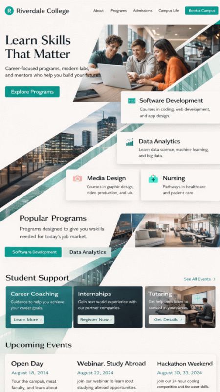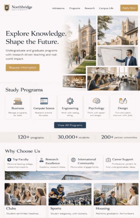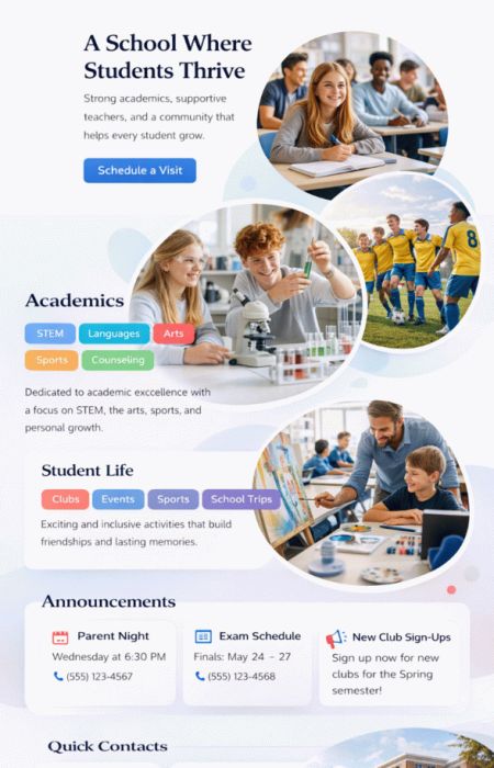 Predstavte školu alebo vysokú školu profesionálne: vízia, kontaktné osoby, odborné oblasti, termíny, sťahovania, prístup. Novinky sa dajú viesť spolu s archívom, aby zostali informácie dlhodobo dostupné. Triedne fotografie a projekty môžu byť zobrazené ako galérie – so schváleniami a voliteľnými viditeľnosťami podľa oblasti. Výsledok pôsobí moderne a ostáva pre používateľov jednoduchý na pochopenie.